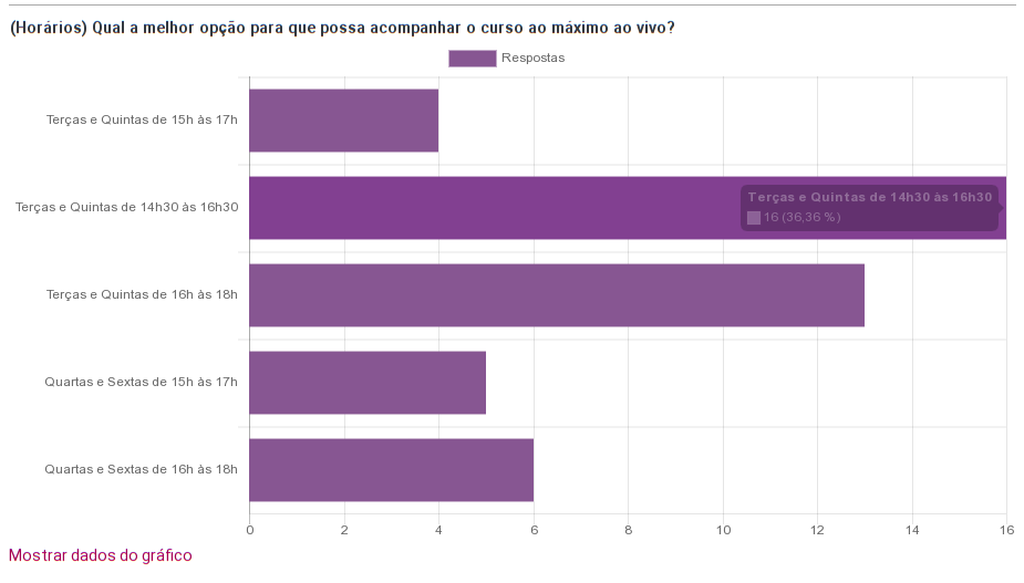 O resultado da enquete manteve o cronograma, em princípio, para terças-feiras e quintas-feiras, de 14h30 às 16h30: